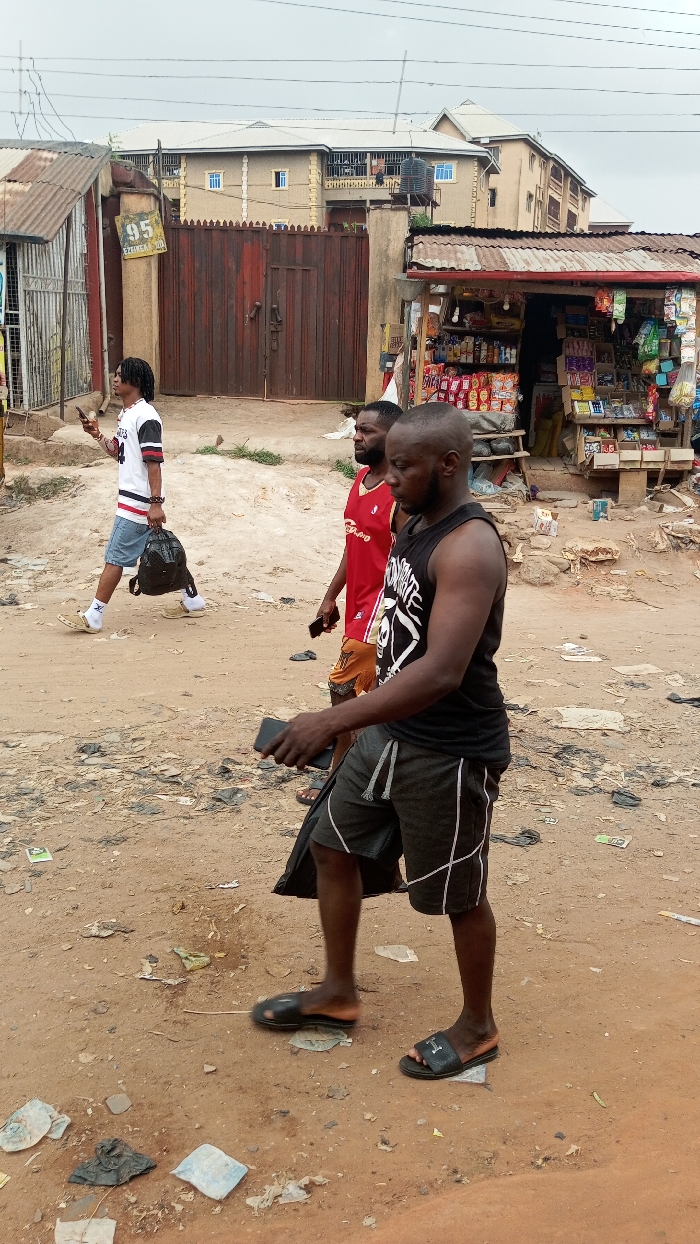 This image depicts an unpaved street scene in Onitsha, Nigeria, under an overcast sky. The ground consists of reddish-brown dirt and sand, marked with scattered litter and debris. Overhead, utility wires are visible. Three adult males are walking on the dirt path. In the foreground, a dark-skinned male with a bald head and beard wears a black sleeveless shirt with a white graphic, dark shorts with white side stripes, and black slides. He holds a black smartphone in his right hand and walks from right to left. Slightly behind him, a second dark-skinned male with a beard wears a red basketball jersey, identifying as "Cavaliers," and patterned shorts. He also holds a smartphone and walks in the same direction. To the left, walking from left to right, a third dark-skinned male with dreadlocks wears a white and black/red sports jersey, light blue denim shorts, white socks, and light-colored clogs. He carries a black backpack in his left hand and a smartphone in his right. Architectural features include a large, reddish-brown corrugated metal gate, centrally located in the mid-ground, with a yellow street sign reading "95 EZIKE (ST)" affixed to it. To the immediate left of this gate is a smaller structure with corrugated metal roofing and walls. To the right of the gate, an open-front stall with a corrugated metal roof displays various packaged goods on shelves, indicating a convenience shop. In the background, a multi-story building with light-colored walls and blue-framed windows is visible, with a black water tank installed on a rooftop platform.