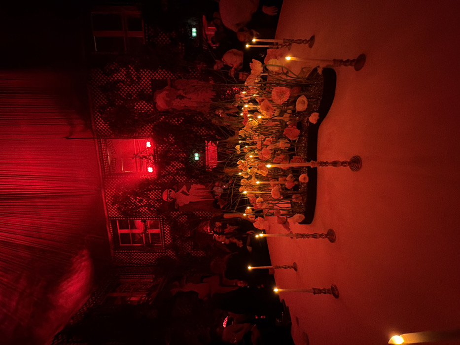 An indoor event space is depicted, illuminated predominantly by red light, creating a dramatic atmosphere. The specific location within Paris, France, is not discernible from the image. In the foreground, a large table covered with a solid red tablecloth supports a central floral arrangement. This arrangement, shaped irregularly, consists of numerous orange and red flowers, likely poppies, interspersed with dark, thin stems. Multiple lit taper candles are integrated directly into the floral display. Around the centerpiece, additional lit taper candles in dark, ornate candelabras are positioned on the tablecloth. In the midground and background, numerous blurred figures of individuals are visible, indicating a social gathering. They are mostly standing, some appearing to converse or observe. The background features a dark, patterned wall structure, resembling a building facade with several windows, one of which brightly emits red light. Overhead, vertical draped fabric or similar linear elements are present.