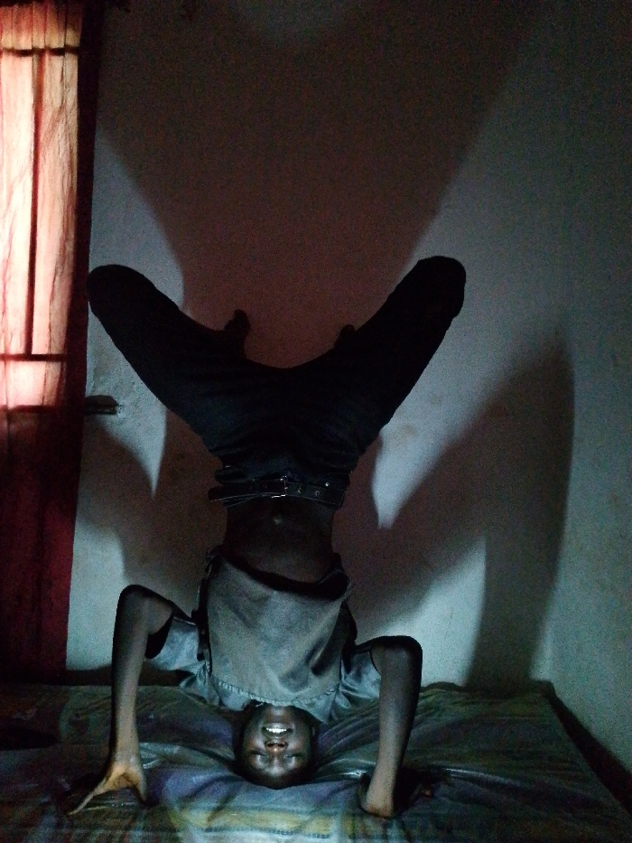 A young person performs a headstand on a bed in a dimly lit room. The individual wears dark pants with a belt and a light-colored shirt, their feet splayed open. A shadow stretches across the wall behind them, mirroring the V-shape of their legs. A window with dark curtains hangs to the left, casting a subtle light. The room's overall color palette is subdued, dominated by dark and muted tones.