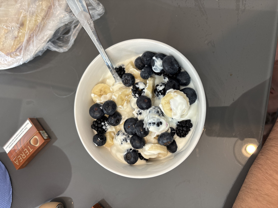 - "The image displays a white ceramic bowl filled with yogurt, blueberries, blackberries, and sliced bananas, with a silver-colored spoon partially immersed" by FM-F81wx1, licensed under CC BY 4.0