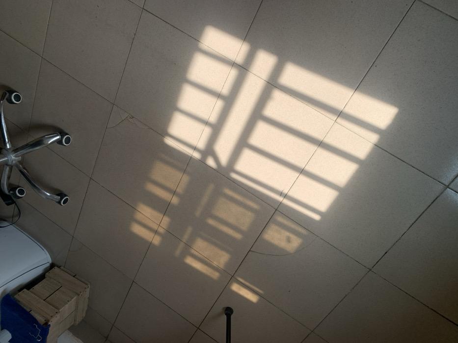 The image depicts an interior scene on a tiled floor in what appears to be a room within the city of Ado, Nigeria. The floor consists of light-colored (beige/tan) square tiles with dark grout lines, exhibiting minor cracks and wear. Strong, natural sunlight enters the room, casting prominent shadows across the floor. A distinct shadow on the right side of the frame originates from a window, revealing a grid pattern consistent with window panes or security bars. A fainter, rectangular shadow with vertical elements is visible on the left side of the floor, suggesting another light source or window. Objects visible in the scene include: * The lower portion of a chrome-legged office chair with five black wheels, positioned in the upper right quadrant. * A stack of light-colored wooden crates or a similar wooden structure, with a blue fabric or object resting on top, situated in the upper left corner against a wall. * A partial view of a white appliance, possibly a refrigerator or cabinet, located behind the chair and crates. * Dark electrical cables are visible on the floor near the base of the office chair. * A thin, dark, vertical pole-like object is partially visible along the far left edge of the image. No individuals or direct interactions are visible. The environment suggests an indoor office or residential setting, characterized by sunlight and functional items.
