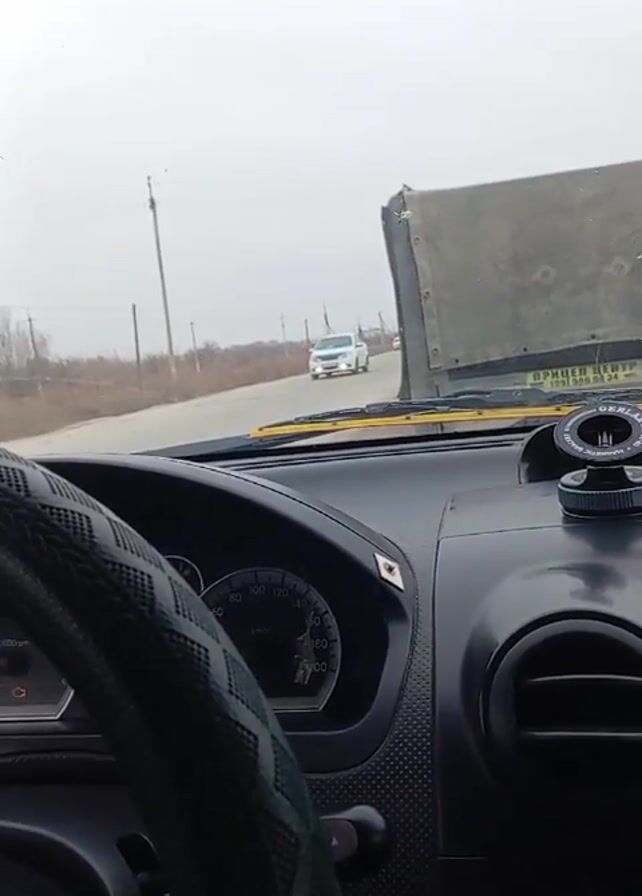 dashboard and steering wheel of a moving vehicle, likely a car or truck, as seen from the driver's perspective