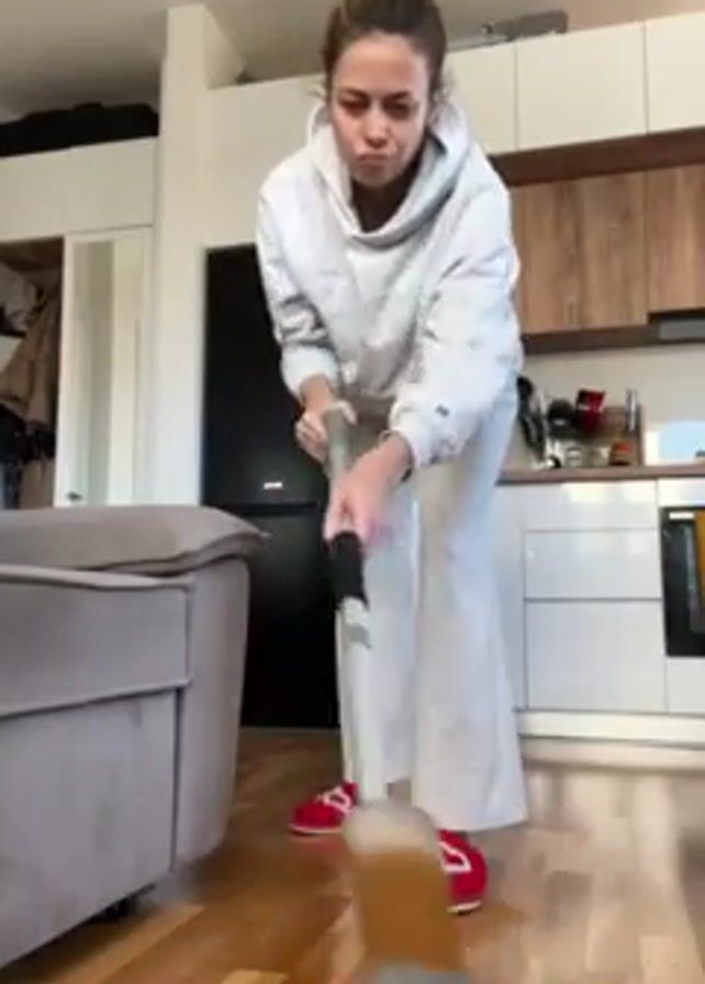 A woman in a white hoodie, white pants, and red slippers is mopping a hardwood floor. The mop is gray and white with a spray function. She appears to be in an apartment, with a gray couch to her left and a kitchen in the background with white and wood cabinets, a black refrigerator, and an oven. Her hair is in a messy bun. She seems displeased with the mopping process.
