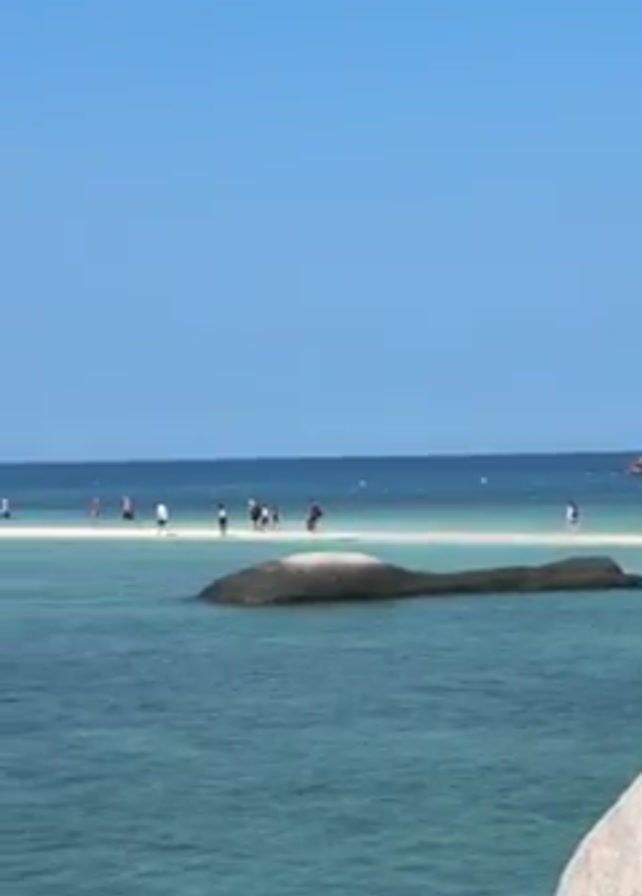 beautiful beach scene on a clear, sunny day. In the foreground, there are large rocks partially submerged in turquoise water. Further out, a narrow strip of white sand is visible, with several people walking and standing on it. A boat is anchored in the distance. As the camera pans to the left, it reveals a small island covered with lush green vegetation, including palm trees. Buildings are nestled among the trees on the island's slope. The sky is a clear, bright blue. The overall scene is peaceful and inviting.