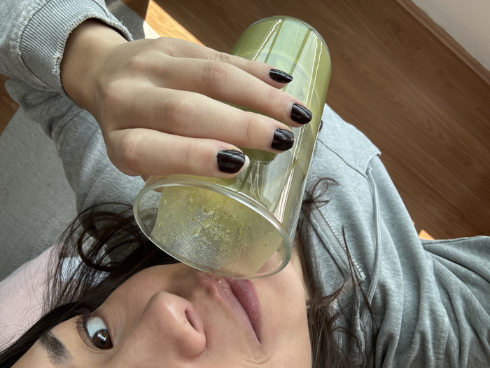 The image depicts a close-up, high-angle view of a person, identified as female, from the nose to the chest, focusing on her upper right torso and right hand. She has dark hair and is wearing a grey zippered hooded sweatshirt with ribbed cuffs. Her lips are slightly parted and in contact with the rim of a tall, clear glass. Her right hand, featuring fingernails painted with dark, possibly black, polish, firmly grips the glass. The glass contains an opaque, light green liquid, consistent with a smoothie or juice, with some visible froth or particulate matter near the surface and a large, square ice cube submerged. Her right eye is visible, looking upwards and slightly to the right. The background includes a wooden floor with parallel planks in the lower left and center, and a soft, light-colored (possibly pink or beige) surface in the upper right. Natural light sources create distinct shadows on the subject's hand and the floor. The individual is engaged in the act of consuming the beverage. No visual information within the image permits identification of a specific location within the city of Naucalpan de Juárez, Mexico, or any other geographical area.