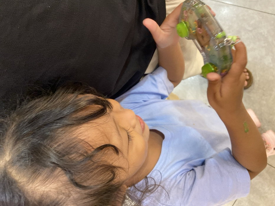 An overhead view captures a young child, approximately 2-4 years old, with dark, curly hair, dressed in a light blue short-sleeved t-shirt. A green mark is present on the child's left forearm, and pink footwear is partially visible on the left foot. The child is holding a clear plastic toy with green accents and internal colorful components, including a light brown animal figure, looking down intently at the object. To the child's right and slightly behind, a portion of an adult's torso and right arm is visible, clad in a black top and light-colored lower garment. Brown footwear is visible on the adult's right foot. Both individuals are standing on a light-colored, tiled indoor floor. The background is out of focus and dark. The precise location within Surabaya, Indonesia, cannot be determined from the visual information provided.