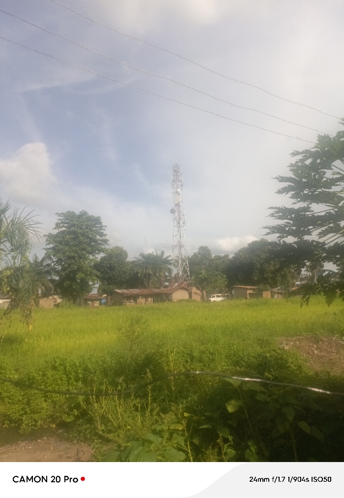 The image displays an outdoor scene in Makurdi, Nigeria, under a partly cloudy sky. The foreground is covered by a dense, vibrant green field of mixed vegetation. A dark, thin horizontal line, resembling a cable or wire, is visible across the lower-mid portion of the foreground. In the midground, a cluster of single-story structures with reddish-brown corrugated metal roofs is situated, partially concealed by surrounding trees. A white van or small bus is discernible behind these buildings, towards the right. The background features a tall, silver-colored lattice telecommunications tower, equipped with multiple antennas and dishes, positioned slightly right of the frame's center. This tower is set amidst abundant green foliage, including various trees and palm trees. No individuals or specific actions are observed in the scene.