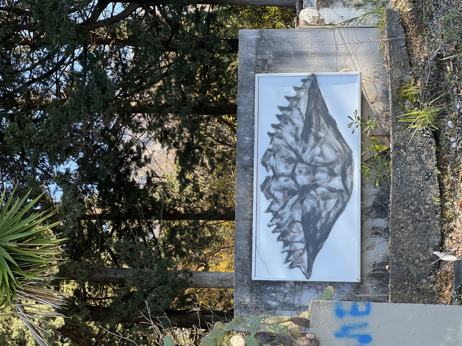 An outdoor scene in Kamenovo, Montenegro, features a large horizontal white board mounted within a weathered grey concrete structure. The board displays a central, dark grey, abstract drawing resembling a spiky, undulating form, with faint red markings on its left side. To the left of the board, a vertical concrete beam exhibits blue spray paint graffiti. A prickly pear cactus grows on the concrete structure to the left. Sparse green vegetation, including grass and small shrubs, is visible at the base of the concrete structure and on the immediate ground. The upper portion of the frame is dominated by dense evergreen trees with dark foliage, through which patches of blue sky are visible. A large, green palm frond extends into the upper left corner of the image. The scene is illuminated by daylight, casting shadows.