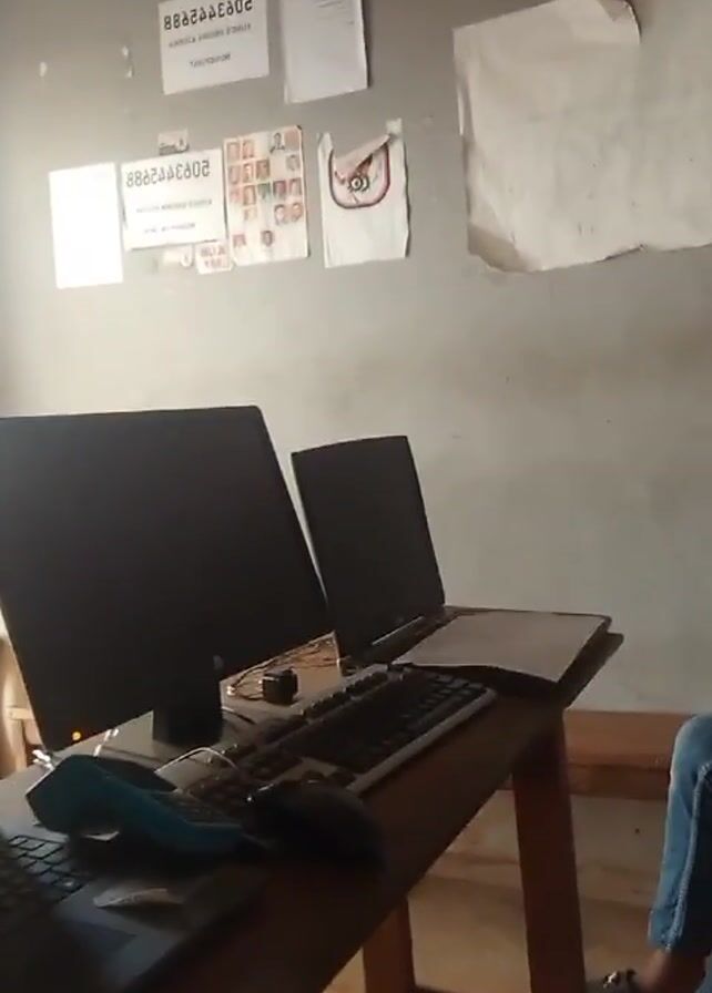 interior of a room where at least two people are present. Initially, the focus is on a desk that holds a desktop computer, a laptop, a keyboard, and a mouse. A notebook lies open on the laptop. The wall behind the desk is adorned with a variety of papers and documents. As the camera moves, it reveals a person seated in an orange chair, looking at a mobile phone. Finally, the camera turns to reveal a woman with braided hair, wearing a red dress. She smiles and holds up her thumb to the camera.