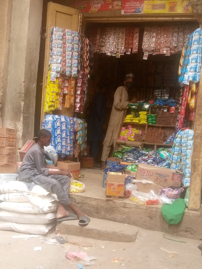 This image displays the entrance of a small provision shop in Arawa, Nigeria