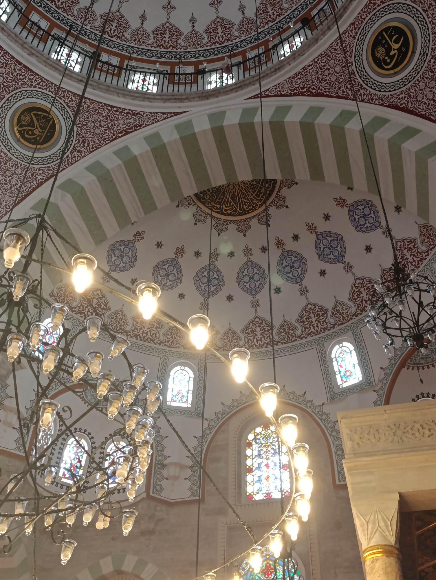 The image depicts the interior of a mosque, potentially located in Üsküdar, Turkey, due to the architectural style. The focal point is the ornate ceiling, adorned with intricate patterns, calligraphy, and stained-glass windows. Chandeliers hang from the ceiling, their illuminated bulbs creating a bright and striking contrast against the painted surfaces. The overall impression is one of grandeur and religious significance.