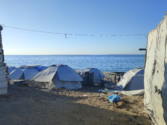 The image depicts a coastal encampment in Al-Mawasi, Unknown, under a clear blue sky