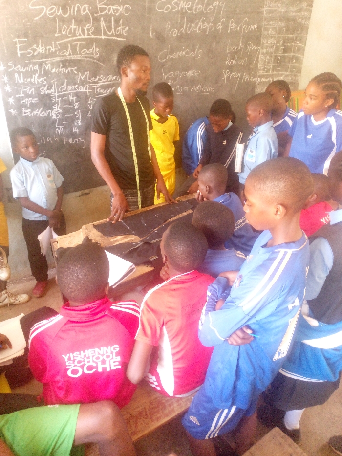 The image depicts an indoor vocational training session in Narayi, Nigeria. An adult male instructor, wearing a black t-shirt and a yellow measuring tape around his neck, stands centrally, gesturing towards a piece of dark fabric laid on a wooden table. Approximately fifteen children and young adults are present, primarily focused on the instructor and the fabric. Some students are seated on benches, while others stand around the table. The background features a large black chalkboard with white chalk writing. Prominently displayed are the headings "Sewing Basic Lecture Note" and "Cosmetology," with sub-sections for "Essential Tools" (listing items like "Sewing Machine," "Needles," "Pin," "Tape," "Buttons") and "1. Production of Perfume" (listing "Chemicals," "Fragrance," "Body Spray," "Roll-on," "Spray Perfume"). Measurements for "Shirt" and "Trouser" are also visible. Students are dressed in varied attire, including yellow t-shirts, light blue button-up shirts, blue athletic wear (some with Adidas branding), and red tops. One student's red jacket clearly displays "YISHENNG SCHOOL OCHE." Several students are observing intently; one standing student in a blue top has arms crossed, while others are looking at the fabric or holding notebooks. The floor appears to be concrete. The scene suggests a practical demonstration or lesson in tailoring or fashion design within an educational or vocational context.