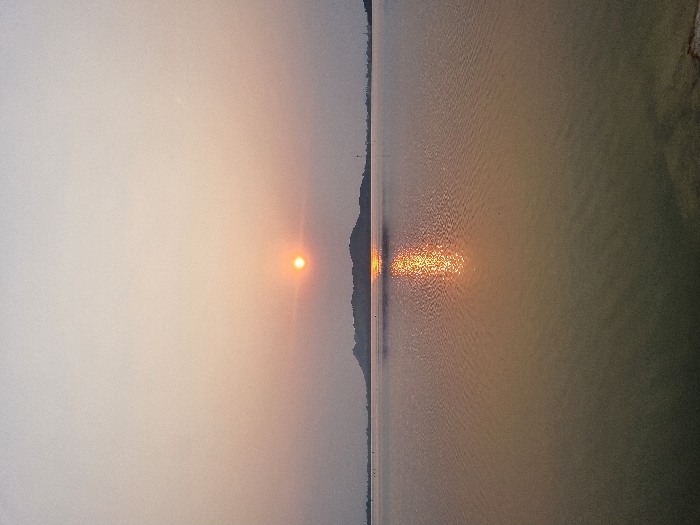 The image displays a landscape photograph captured at sunset over a large body of water in Kammavaripalli, India. The sun, a prominent orange-yellow orb, is positioned centrally on the horizon line, casting a distinct, shimmering vertical reflection that extends across the water's rippled surface towards the viewer. A dark, undulating landmass forms a silhouette against the horizon, spanning horizontally behind the sun. The sky above transitions from a pale grey-blue at the zenith to warm orange and pink hues closer to the horizon. The body of water in the foreground exhibits subtle ripples and appears a muted greenish-brown, shifting to reflect the sunset's colors closer to the horizon. No individuals are present in the scene. A faint, slender vertical structure, possibly an antenna or wind turbine, is discernible on the far right horizon, situated above the distant landmass.