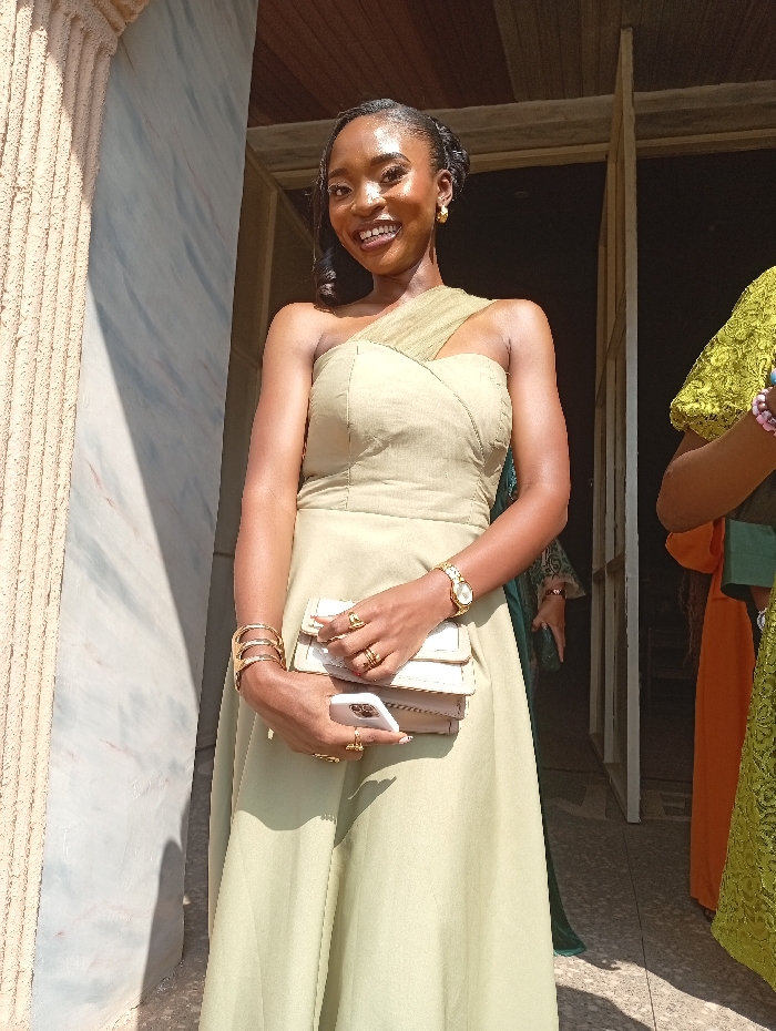 A young adult female, appearing of African descent, stands smiling outdoors in an architectural setting in Enugu, Nigeria
