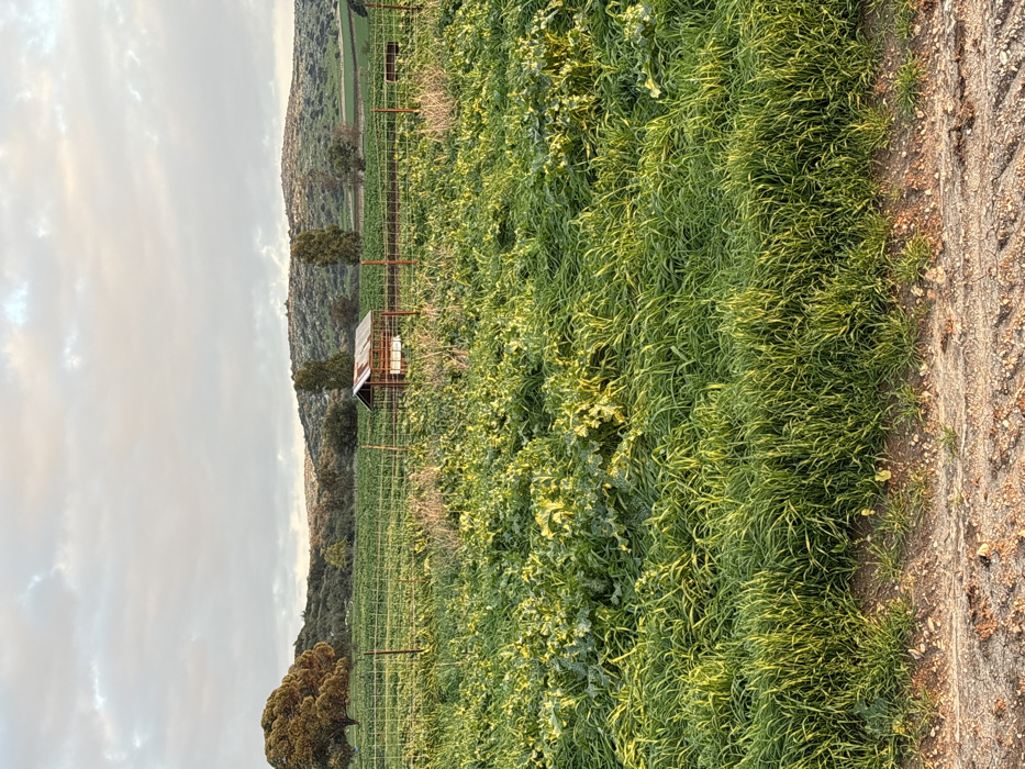 A rural scene shows a field divided by a wire fence. Lush green grass and broad-leafed plants fill the field. A small metal shed-like structure with white objects inside is visible. Beyond the field, a tree-covered hill rises against a cloudy sky. A dirt track runs along the edge of the field, contrasting with the green vegetation. The lighting suggests either early morning or late afternoon.