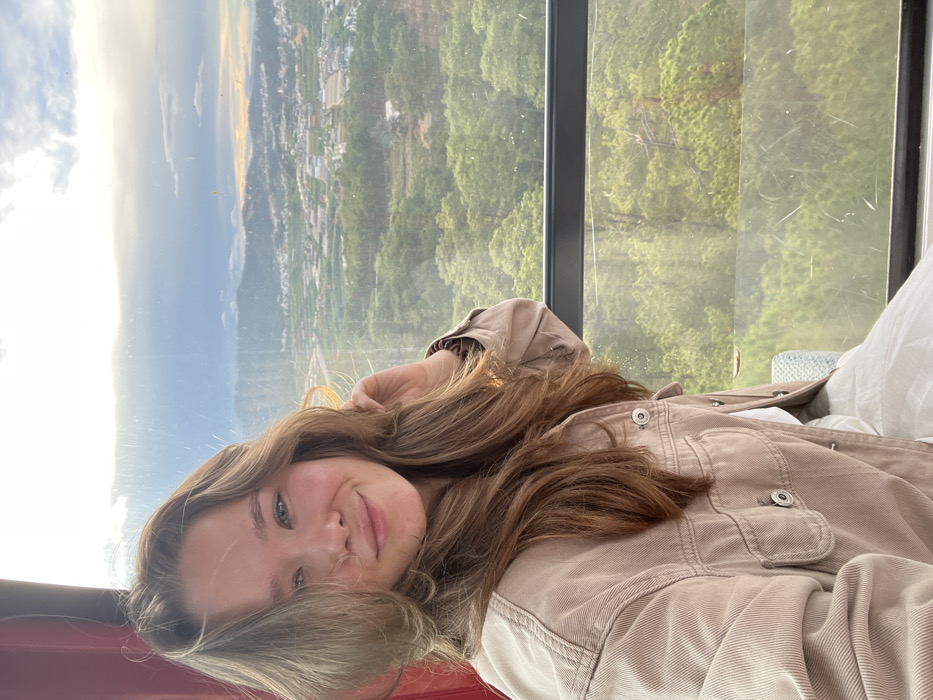 A young Caucasian female, with long wavy brown hair and blue eyes, is depicted in a close-up image taken inside a red cable car cabin