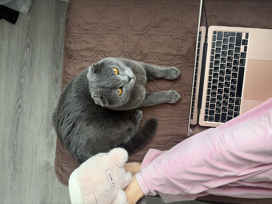 An indoor scene in Novosaratovka, Russia, captured from a high-angle perspective. The primary subjects are a grey Scottish Fold cat with amber eyes, partially extended, and a person's lower left limb. The cat is positioned on a brown, quilted blanket with a hexagonal pattern, its body angled towards the left while its head faces the camera. The person's left foot, adorned with a pink, plush slipper labeled "FOLLOW ME," is situated to the left of the cat. The person's lower leg is covered by a pink, long-sleeved garment, likely a pajama or loungewear top. Below the person's leg and extending into the lower right frame is an open, rose gold laptop featuring a Cyrillic keyboard layout. The background reveals light-colored wooden flooring to the upper left and top.