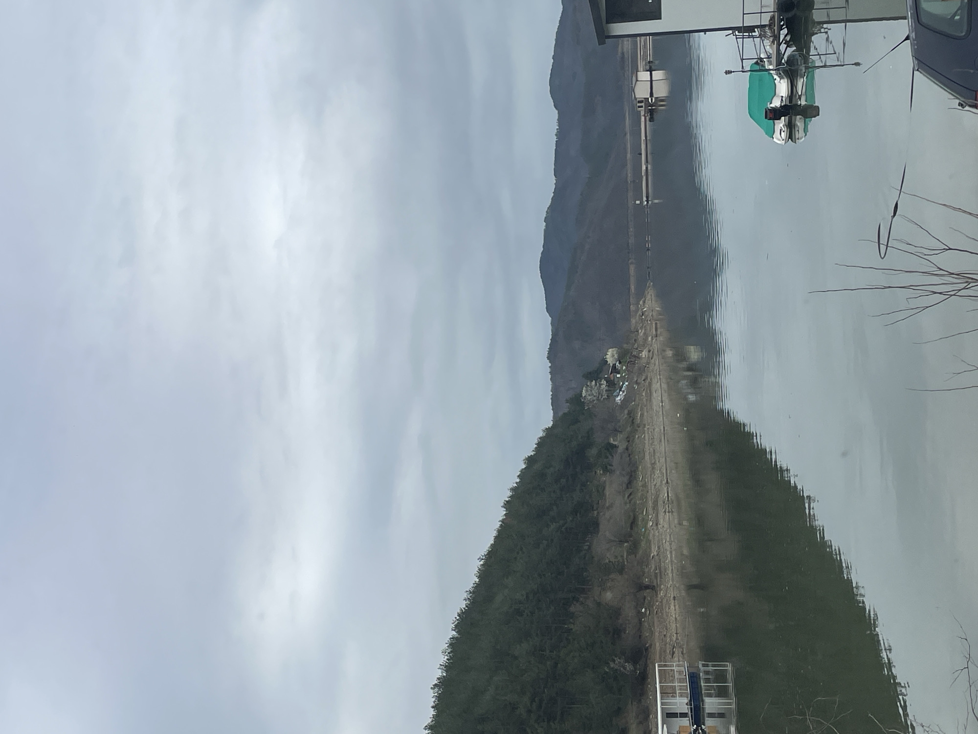 The image depicts a mountain reflecting off the calm waters of a body of water. The sky is overcast with light gray clouds. A building or structure is present on the right edge of the image. A boat with a green covering can be seen near the structure. In the foreground, there is a small structure or dock, possibly made of white metal bars. The location is Brosh, Bulgaria.