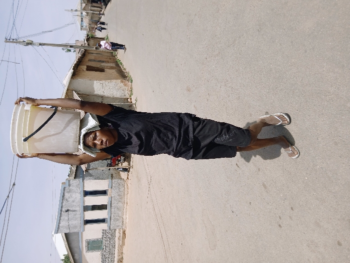 An individual is depicted mid-stride on a paved street in Kwekwe, Zimbabwe, under direct sunlight. The person, dressed in a black short-sleeved t-shirt, black shorts with white lettering, and white flip-flops, carries a white plastic bucket on their head, supported by both hands raised upwards. A light-colored cloth or towel is positioned between their head and the bucket. Their gaze is directed forward. Shadows are cast clearly on the light grey road surface. In the background to the left, a light-colored building with a textured stone base and three dark-framed vertical windows is visible, with a red motorcycle partially parked nearby. To the right, a series of single-story structures with earth-toned walls line the street. Further down the road, several indistinct figures walk away from the camera. Two wooden utility poles with overhead wires run along the right side of the street. The sky is clear and bright.