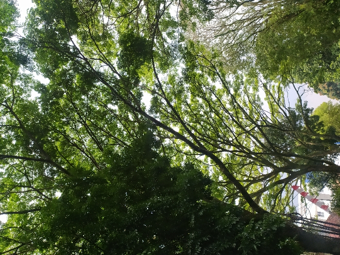 - "The image depicts an upward view into a dense canopy of mature trees, primarily featuring lush green foliage and a network of dark branches against a bright, hazy sky" by FM-SZSmO2, licensed under CC BY 4.0