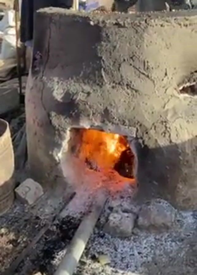 two men preparing what appear to be bicycle tires over an open fire in an outdoor setting. The oven is constructed of mud or clay. One man, wearing a black cap and jacket, stands to the left of the oven, holding a long stick. The second man, wearing a baseball cap and a light-colored shirt, stands in front of the oven and lifts a large tire above the opening. The fire is visible inside the oven. Outside the oven, there are various items, including a barrel, pieces of wood, and a metal pipe connected to an electric blower. In the background, there is a mountainous landscape.