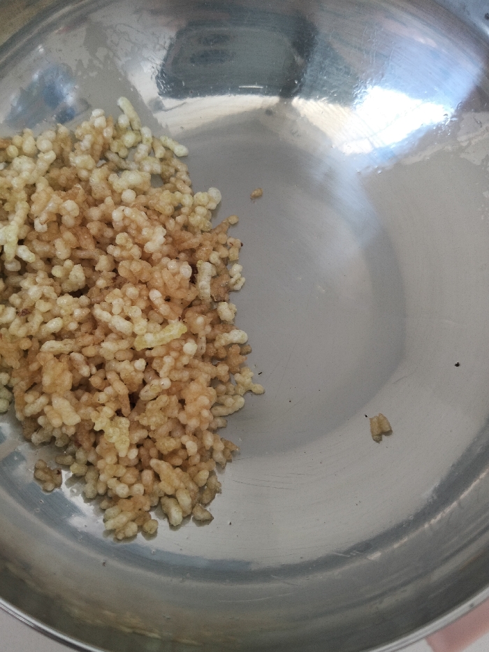A portion of a polished metal plate is covered in small, yellowish-brown, granular bits. The remaining surface of the plate is mostly empty, revealing its shiny, reflective properties. A few stray pieces of the granular material sit isolated on the clear area, and a tiny dark speck is also present on the metal surface. The overall composition highlights the contrast between the textured food and the smooth, reflective plate.
