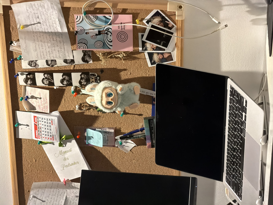 A corkboard cluttered with pinned items including handwritten notes, black and white photos, a card featuring circular designs, and Polaroid pictures. A plush toy is centrally placed. A 2026 January calendar, a booklet titled "Manual dos Padrinhos," and a note with blue ink are also visible. A laptop and a black tablet stand on the right and lower center, partially obscuring the board. A white cable dangles from the top corner.