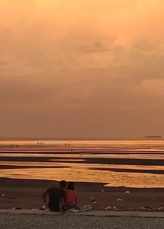 beach scene at sunset. The sky is a vibrant orange with large, puffy clouds. The tide is out, leaving a landscape of sand and shallow water channels. In the distance, several figures are visible walking along the beach. A large ship is also visible on the horizon. In the foreground, a couple is sitting on the beach, looking out at the ocean. A young person runs past them. The beach appears to be relatively clean, with a few pieces of litter scattered around. The video is shot from a low angle, emphasizing the vastness of the sky and ocean.