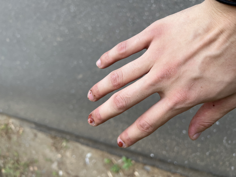 A close-up, dorsal view of a human left hand is depicted against an outdoor backdrop in Chiba, Japan. The hand exhibits multiple injuries: the index finger shows raw skin and fresh blood at the fingertip/nail area, the middle finger has dried blood or dirt at its fingertip/nail, and the ring finger displays fresh blood on its fingertip. A small, dark, dried blood spot is present on the dorsal side of the thumb near its base. The skin on the back of the hand and knuckles appears reddened and dry. The background consists of a concrete curb or edge on the left, bordering a lighter, rougher ground area with sparse vegetation, and a darker, smoother paved surface, likely asphalt, on the right and in the foreground. No other individuals or active interactions are visible.