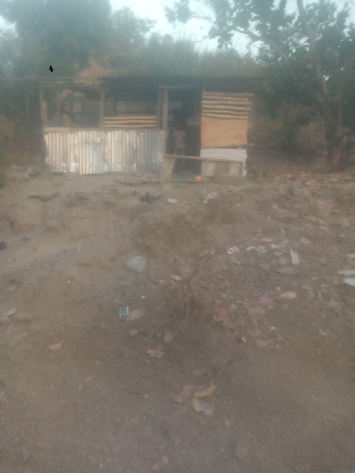 A weathered shack stands amidst a dusty, debris-strewn landscape. Its structure consists of corrugated metal, wooden planks, and a thatched roof, offering a makeshift shelter. A person is visible inside the shack's entrance. Scattered trash litters the foreground, highlighting the area's disrepair. Trees partially frame the shack, adding a touch of nature to the scene.