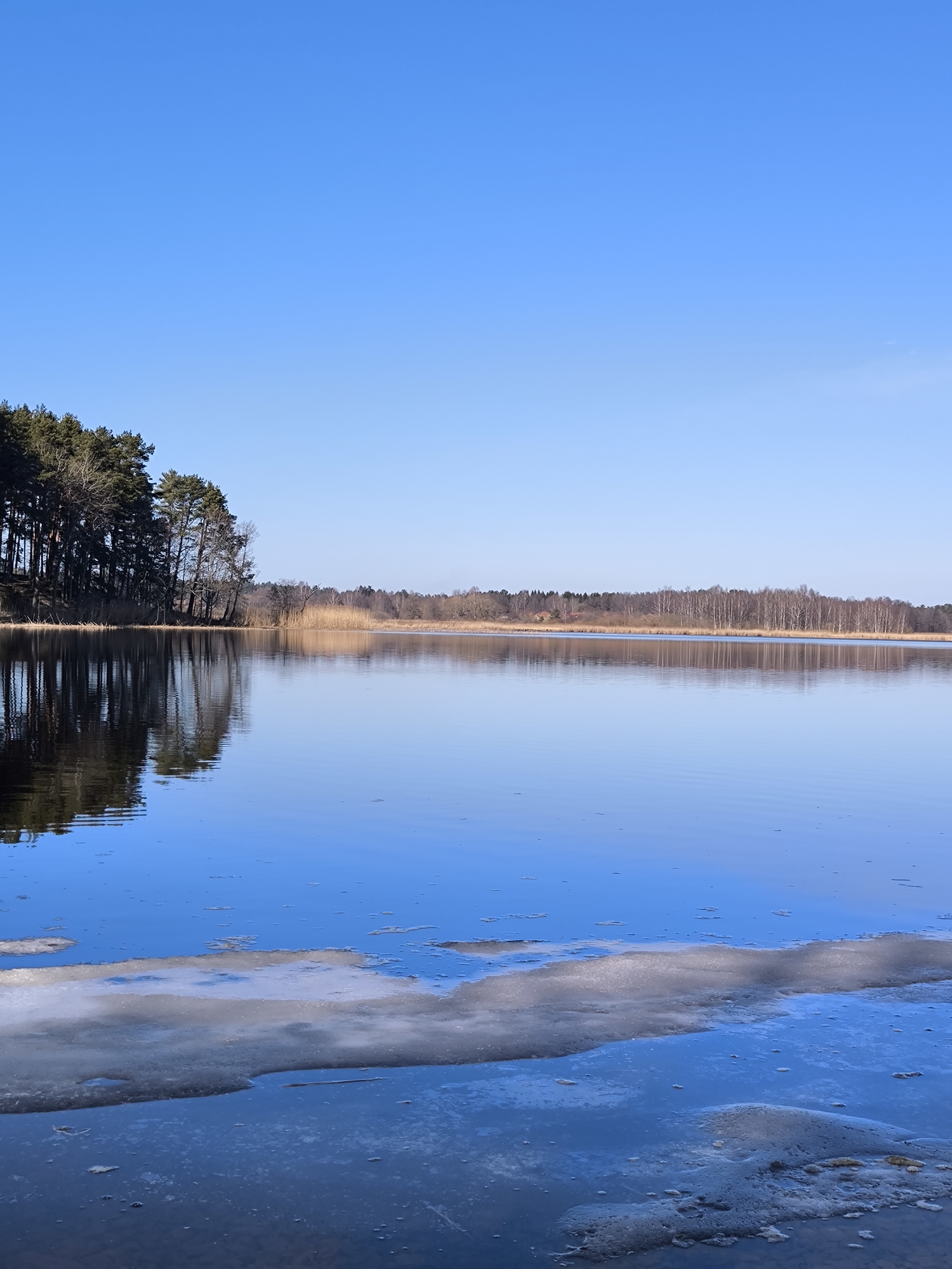 The image depicts a tranquil natural landscape, likely a lake or large body of water, located in Spuņciems, Latvia, under a clear, bright blue sky. Approximately 40-50% of the upper frame is occupied by the unobstructed sky. The lower portion of the image features calm, reflective water, predominantly blue, mirroring the sky and surrounding topography. In the immediate foreground, particularly towards the bottom right and center-left, are fragmented patches of melting ice and slush on the water's surface, accompanied by minor surface foam or debris. Along the left bank, a dense line of tall coniferous trees, primarily pines, stands erect, with several bare deciduous trees interspersed. These trees cast distinct, dark reflections onto the water's surface. The far bank in the background presents a distant treeline consisting of both bare deciduous and coniferous trees. Patches of dry, light brown reeds or tall grasses are visible along the immediate edge of the far bank. A small, light-colored structure with a brown roof is faintly discernible nestled among the trees on the far bank, slightly left of the image's horizontal center. No individuals, animals, or explicit human activities are depicted within the frame.