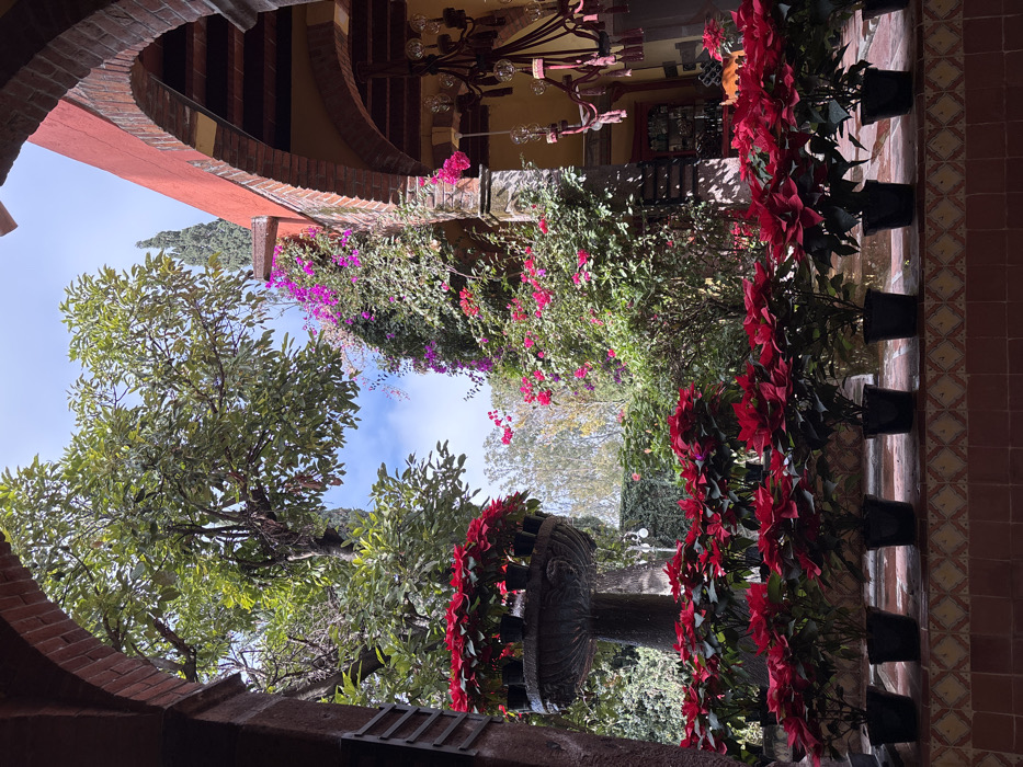 A courtyard view showcases vibrant flora and architecture. Poinsettias in black pots line a tiled ledge, leading to a stone fountain adorned with more red flowers. Above, bougainvillea drapes from the walls, framing a vista of trees and a blue sky. The scene is framed by a brick archway, adding depth and perspective to the lush, colorful garden setting.