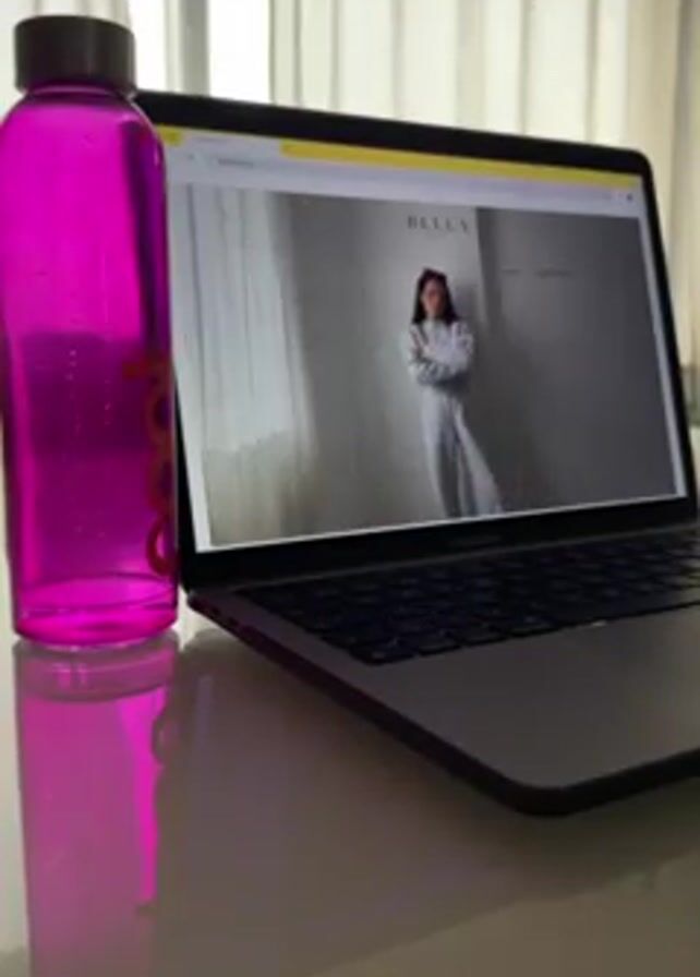 A still shot presents a desk or table with a laptop and a water bottle. The laptop is open, displaying a webpage featuring a woman in a white outfit with the word "BELLA" visible. To the left, a vibrant pink water bottle stands beside the laptop. The table's surface is reflective, mirroring both items. Background curtains diffuse the light, suggesting a room illuminated by daylight.