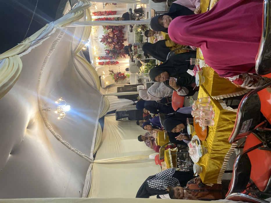 The image captures an evening gathering under a large, white, cream, and gold fabric tent structure in Kecamatan Pati, Indonesia