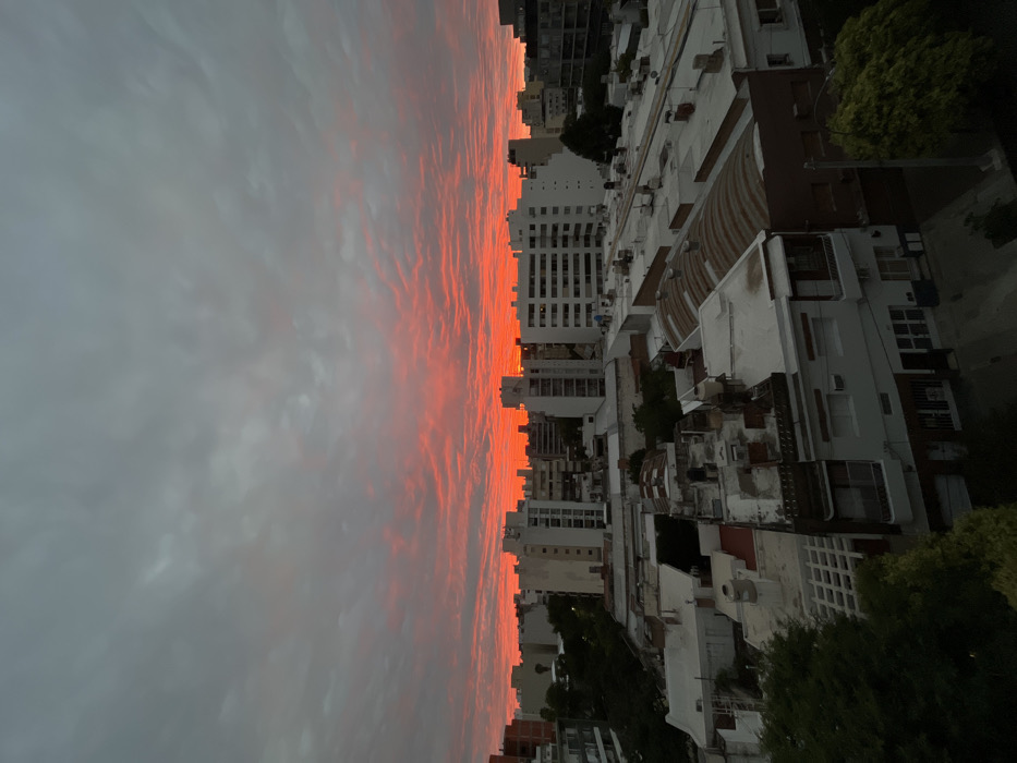 An elevated panoramic view captures an urban cityscape in Cordoba, Argentina, under a dramatic sky. The horizon is dominated by an intense, fiery red and orange glow, indicative of either a sunrise or sunset, which gradually transitions upward into a heavily clouded, dark grey sky covering the upper two-thirds of the frame. The clouds themselves show some reddish illumination from below. The urban environment consists of a dense arrangement of buildings. In the foreground, lower-rise structures are visible, some with flat, light-colored roofs, others featuring corrugated metal roofs with varying degrees of weathering. These buildings appear to be a mix of residential and commercial properties, exhibiting balconies, windows, and utility structures on their rooftops. Scattered green foliage from trees is visible, particularly in the lower-left and central-right portions, partially obscuring some foreground elements. The midground and background feature multiple taller, multi-story buildings, primarily light-colored, appearing as apartment blocks or office buildings with numerous windows arranged in horizontal rows. These structures are packed together, forming a dense urban fabric that extends to the horizon, where the distant cityscape is silhouetted against the bright red sky. No people, vehicles, or specific actions are discernible within the frame. The scene is characterized by its urban sprawl and the striking atmospheric conditions of the sky.
