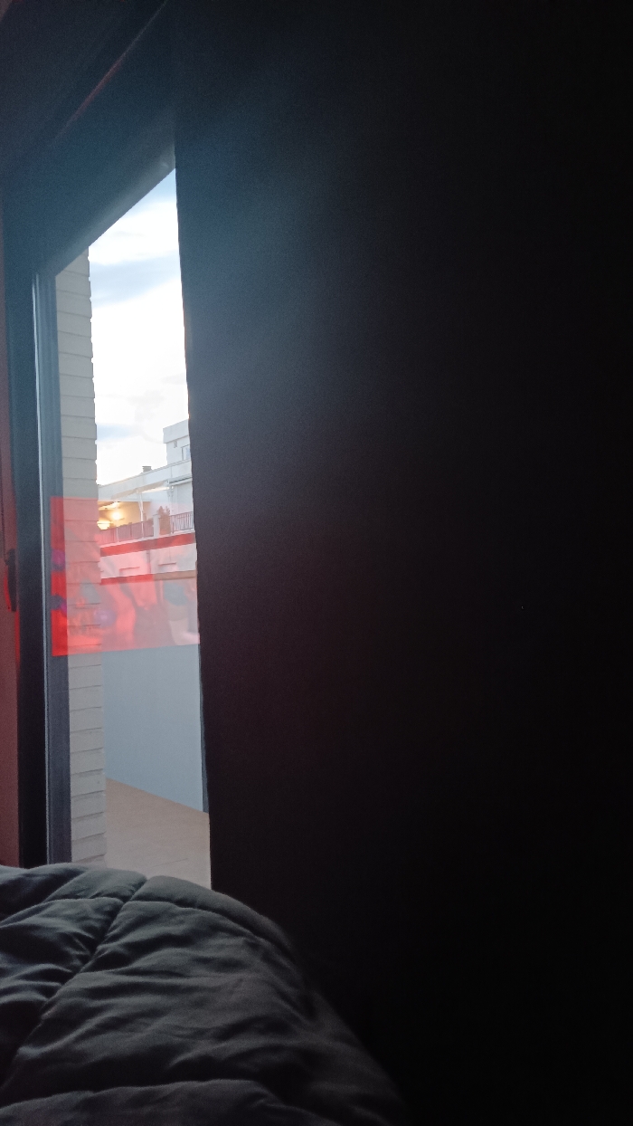 partial view from indoors, through a sliding glass door. The door is partially open, revealing an outdoor space with a building in the background, lit by what appears to be late-afternoon or early-evening sunlight. The rest of the view is obscured by the dark, opaque door panel. A portion of a dark-colored comforter or blanket is visible in the foreground, suggesting the view is from a bed.