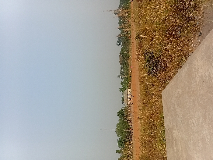 An eye-level, off-center view reveals a vast field of dry grass alongside a dirt path lined with trees. In the distance, a small building or gathering of people is visible. The sky occupies the left portion of the image, while a concrete structure juts into the scene on the right. The contrast between the natural landscape and the man-made structure is apparent. The horizon line appears high in the frame.
