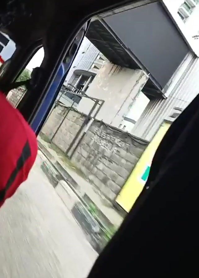From the passenger seat of a blue car, a view of the outside reveals a billboard advertising a product with a woman's face on it. The camera then moves to the side window, showing a cement wall, a sidewalk, and a tall, modern building in the background. A person dressed in black and carrying a red bag walks past the car on the sidewalk. The person in the car reaches up to grab the roof handle.