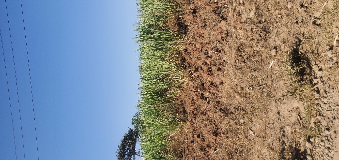 A roadside scene under a bright blue sky, interrupted by distant power lines. Lush green grass lines the side of a dirt road. The terrain transitions from grassy to bare earth, then to a rugged, uneven surface of dry dirt and small rocks. The composition is oriented with the sky on the left.