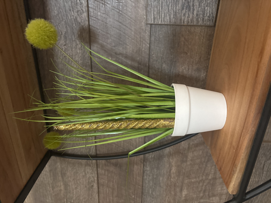 The image depicts an indoor scene located in Nova Zagora, Bulgaria. A white, cylindrical pot containing artificial green grass-like foliage, a gold glitter-covered spiral candle, and two bright yellow spherical fuzzy decorative elements is positioned centrally on a polished light brown wooden shelf. The shelf is supported by a visible black metal frame on the left side of the frame. The background consists of a horizontally oriented, multi-toned gray-brown wood-paneled wall. No individuals are present, and no active interactions or actions are depicted within the scene.
