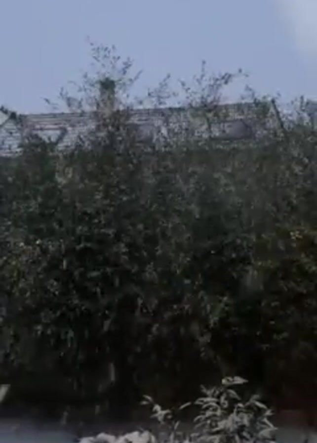 A slightly low-angle, outdoor shot depicts a snowy scene with a building and greenery. The sky is a pale blue-gray, indicating an overcast day. In the background, the top of a building is visible, covered with a layer of snow. A chimney protrudes from the roof. In the foreground, a dense bush or hedge fills the frame. Some of the branches are covered with snow, giving a stark white contrast against the green foliage. Snowflakes are actively falling, visible as white streaks and dots throughout the frame. The camera remains still throughout the video. There are no people visible in the frame.