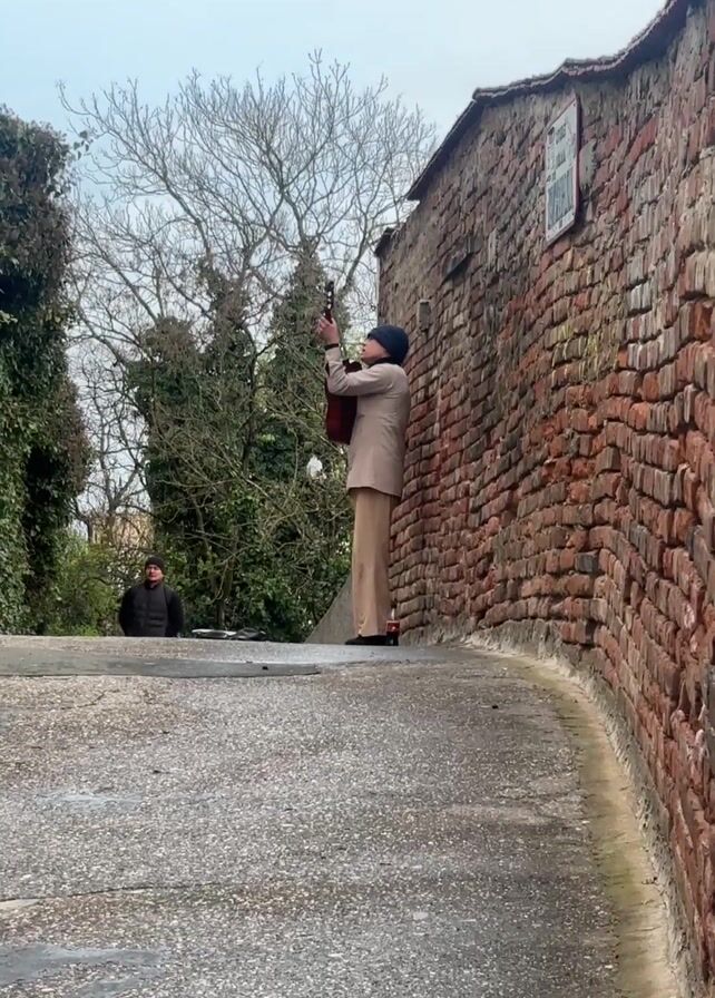 A man stands on an elevated, sloping alleyway, playing a guitar. He is dressed in a matching khaki suit and black beanie. A brick wall rises to his right, with an official-looking sign mounted on it. A bare tree and green ivy line the left side of the alleyway. Another man, wearing a dark jacket, stands at the lower end of the alley. It appears to be a cloudy day.