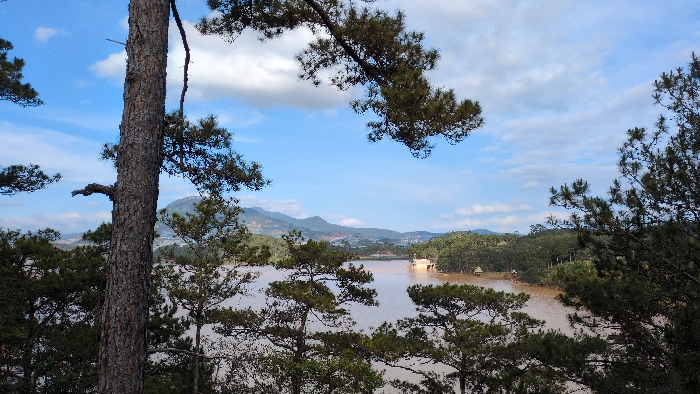 The scene presents a panoramic view of a lake and surrounding landscape at Lán Tranh, Vietnam, under a partly cloudy sky. A large pine tree trunk with dark, textured bark stands prominently in the left foreground, its branches extending into the upper left. Additional pine trees with dark green needles frame the lower and side edges of the image. The midground features a wide body of water, appearing murky brown or reddish-brown. On the far side of the lake, dense green vegetation, predominantly pine forest, lines the irregular shoreline. Within this distant forest and near the water's edge, several small, light-colored structures, possibly huts or shelters, are visible, with one prominent structure appearing on the right side of the lake, close to the water. In the background, rolling hills and mountains rise, covered in varying densities of green foliage, with faint signs of scattered buildings or development on their slopes. The sky is bright blue with scattered white cumulus clouds. No individuals are visible, nor are any specific actions or interactions depicted.