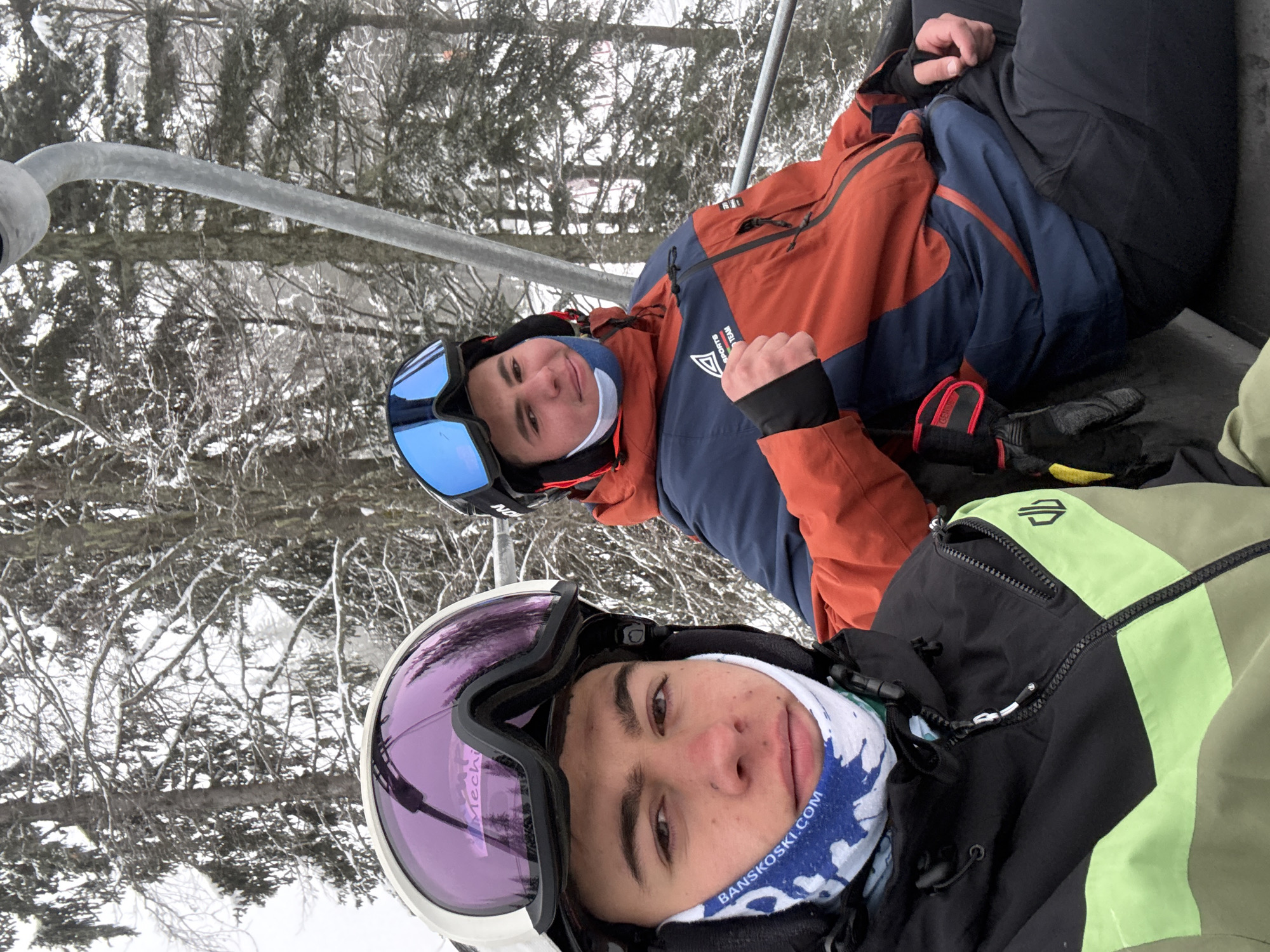 Two young men are riding a ski lift in a winter environment. They are both wearing ski helmets and goggles. The man in the foreground has a white helmet with purple goggles and a blue and white neck gaiter. The man in the background has a blue helmet with blue goggles and a rust-colored jacket with blue panels. There are trees covered in snow in the background. The location is likely near Bansko, as indicated on the neck gaiter of the man in the foreground. Smolyan, Bulgaria is not indicated in the photo.