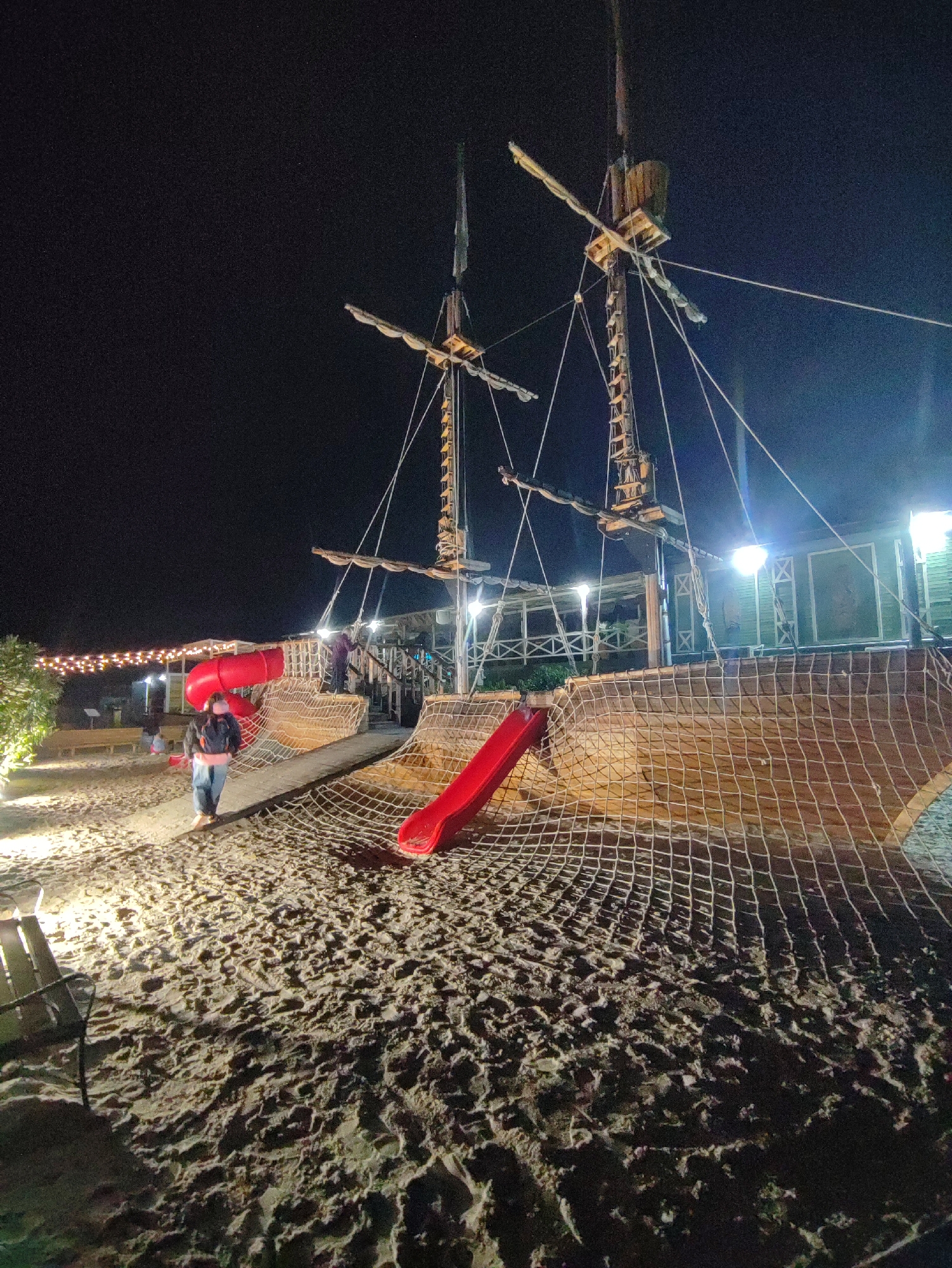 nighttime scene with a large, wooden pirate ship playground structure in what appears to be a recreational area in Sirius, Russia. The ship has two masts and rope netting around its perimeter, with two red slides protruding from the structure. A person is walking on the sandy ground towards the ship, wearing a jacket and a backpack. In the background, there are lights strung up, illuminating benches and possibly a building. The foreground is mostly sandy ground.