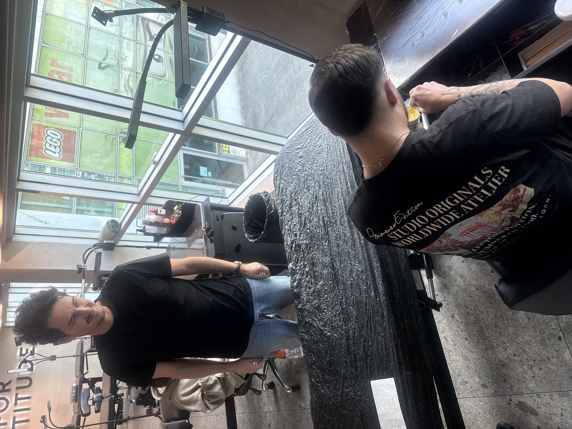 The interior of a shop-like establishment with large windows revealing an exterior view of a building with "LEGO" written on it. Two men are present: one standing looking to the camera and another sitting mixing a yellow substance in a container. The standing man is wearing a black T-shirt and jeans, while the sitting man is also wearing a black T-shirt, which has the words "STUDIO ORIGINALS WORLDWIDE ATELIER". Tattoo equipment and various salon-like chairs are scattered around the scene. There is a black foil-covered object, presumably for hair services, separating the two men. The location cannot be determined from the provided image.