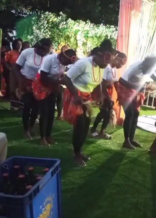 A group of women are dancing at an outdoor event on artificial turf. The women are barefoot and wear white shirts, black leggings, and patterned skirts. Each woman also wears a necklace and a headband. They are bent forward at the waist and moving together as part of their dance routine. Other people stand in the background, some watching the dancers. There are decorations including sheer draping, and green lighting on nearby trees. A blue crate full of beer bottles sits in the foreground.