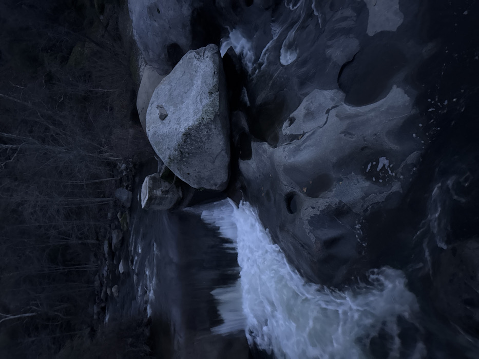This image depicts a natural river scene in Three Rivers, United States, under low light conditions. The primary subject is a dark, fast-flowing river with sections of rapids and a small waterfall. The water exhibits motion blur, indicating a long exposure, with white foam streaking over dark, eroded bedrock. Numerous large, grey boulders are present within and alongside the river. A prominent, light-colored, smooth boulder is centrally located, with a small, dark, heart-shaped stone resting on its upper surface. To the left of this central boulder, a rectangular concrete-like block is partially submerged at the edge of the rushing water. The riverbed is composed of dark, irregularly shaped bedrock featuring several smooth, water-filled potholes. The far riverbank is densely vegetated with bare deciduous trees and shrubs, suggesting a winter or late autumn season. The overall illumination is dim, casting a cool, blue-grey tone over the entire scene. There are no individuals, animals, or discernible human activities depicted.
