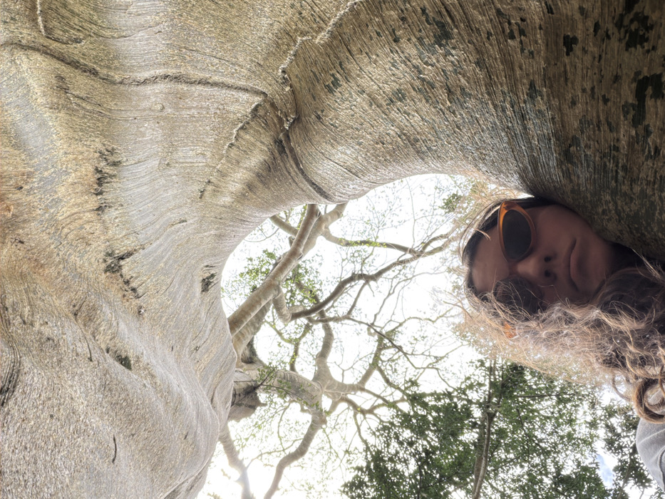 A low-angle shot looking upward through a tree. The smooth, light gray trunk surrounds an opening framing branches against a bright sky. A person wearing sunglasses is partially visible, pressed against the tree trunk, their face partially obscured by the sunglasses and hair. Green foliage is visible in the background. The tree trunk’s unique texture is emphasized by the angle and light.